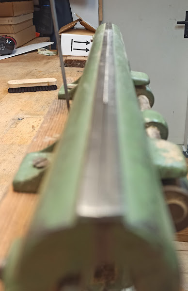 Seit ich im Oktober Andreas von Nordwirke besucht habe, suchte ich nach eine Ulmia Bandsägekluppe. Ich habe bei instagram und in den Verschiedenen Foren Suchaufträge eingestllt. Aber was geklappt hat: Jeden Tag bei Ebay und ebay kleinanzeigen nach Ulmia suchen. Denn der Begriff Bandsägenkluppe oder Sägekluppe ist nicht so geläufig. Heute kam sie an. Sie schließt so gut wie Andreas' Kluppe. Quietschfrei Feilen auf mehr als 40 cm - allerdings nur bis zu einer Blattiefe von etwa 70mm.